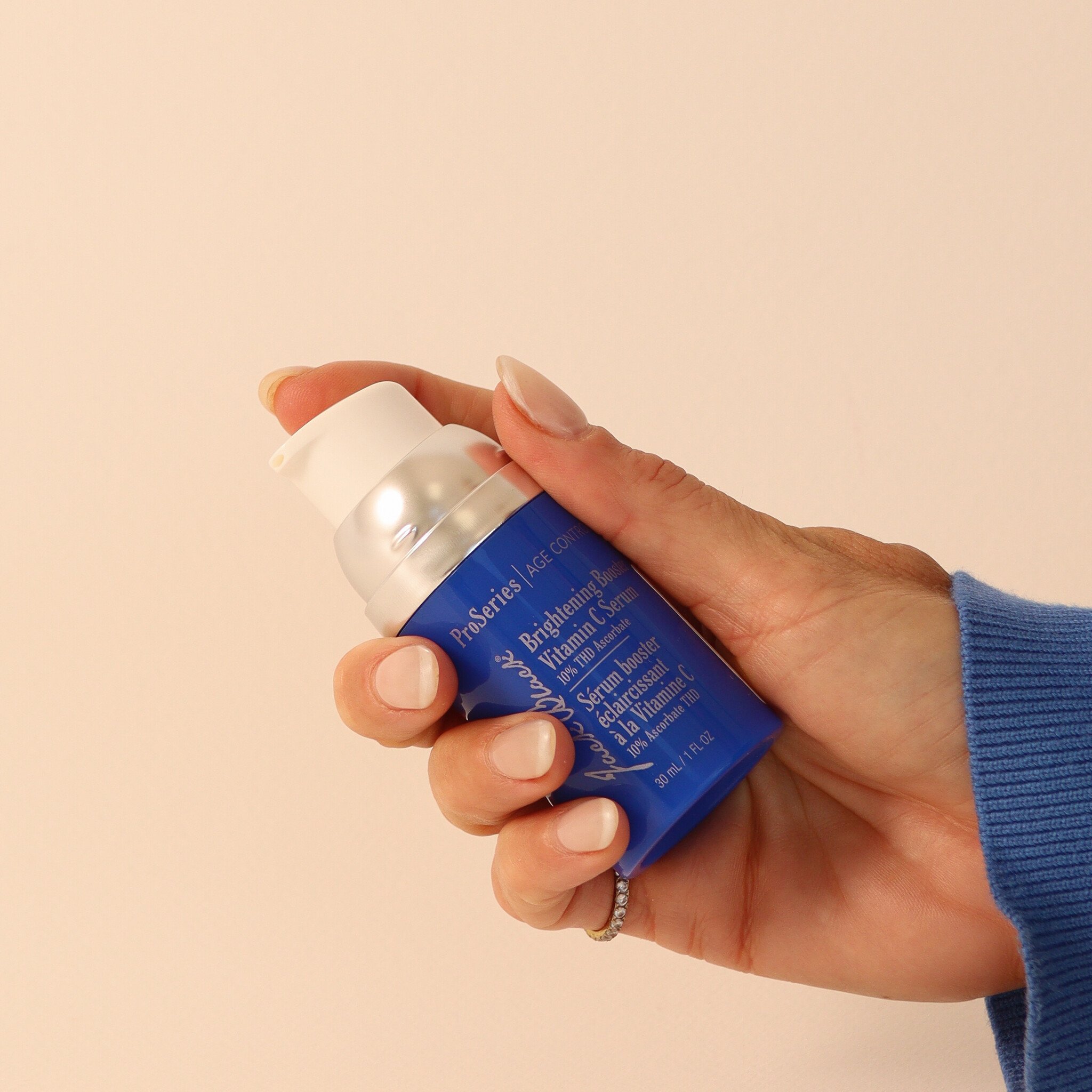 - Ingrédients actifs: ascorbate de tétrahexyldécyle (10% THD-Ascorbate) ester de vitamine C très stable, soluble dans l'huile, dont il a été démontré qu'il améliore l'éclat et la pigmentation de la peau avec une utilisation continue. Acetyl zingerone qui agit comme super-antioxydant aidant à protéger contre les dommages causés par les radicaux libres