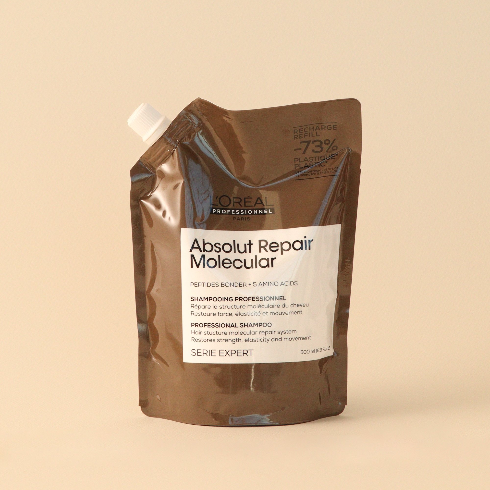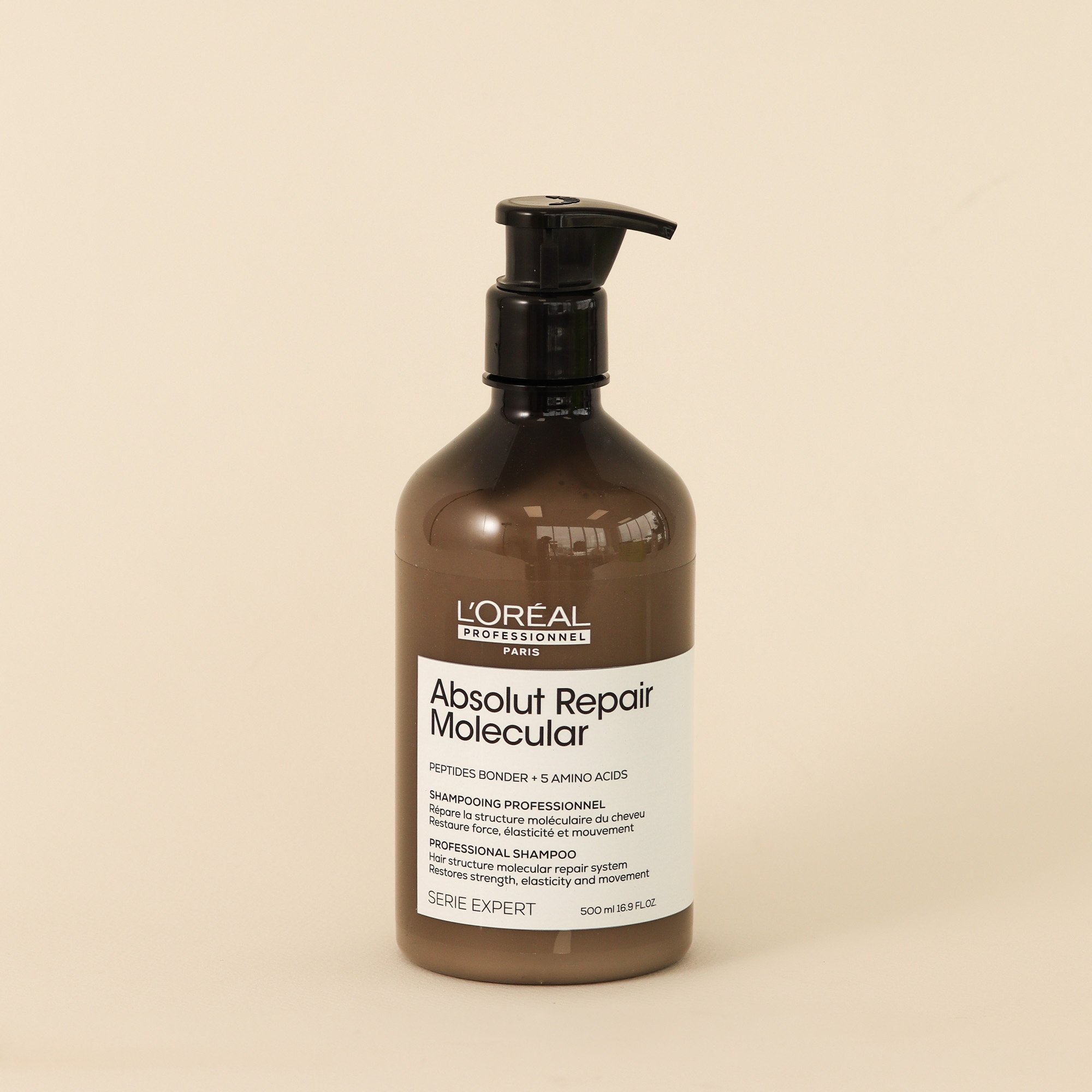 Appliquer une noix de shampoing sur les cheveux mouillés. Masser pour faire mousser. Poursuivre avec le sérum à rincer Absolut Repair Molecular.