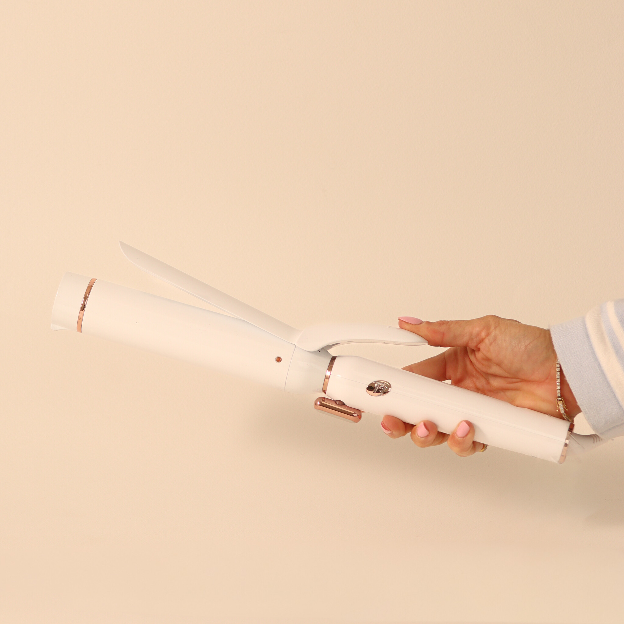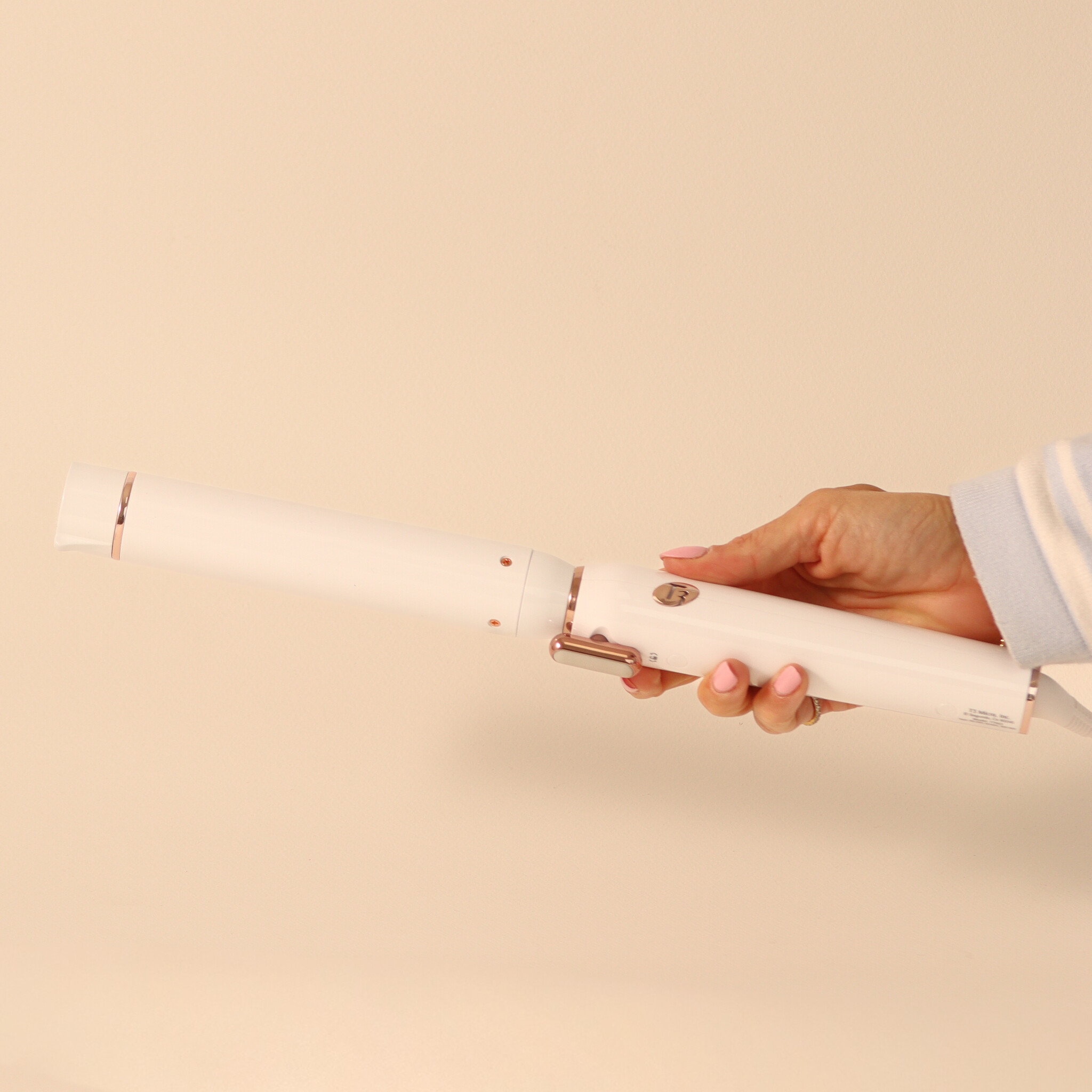 Pour fixer un cylindre, déverrouiller la poignée en tournant le verrou de la position horizontale à la position verticale. Aligner la pince latérale sur le cylindre avec les fentes latérales dans la poignée et insérer fermement le cylindre dans la poignée. Faire pivoter le verrou dans sa position initiale. Appuyer sur l'interrupteur-sélecteur de température pour mettre le fer en marche. Toujours utiliser sur cheveux secs. Tenir la baguette au-dessus de la tête avec le bout pointant vers le bas. À partir des racines, enrouler une section de cheveux de 2.5 à 5 cm autour du cylindre. Maintenir pendant quelques secondes et faire glisser la baguette vers l'extérieur pour libérer la boucle.